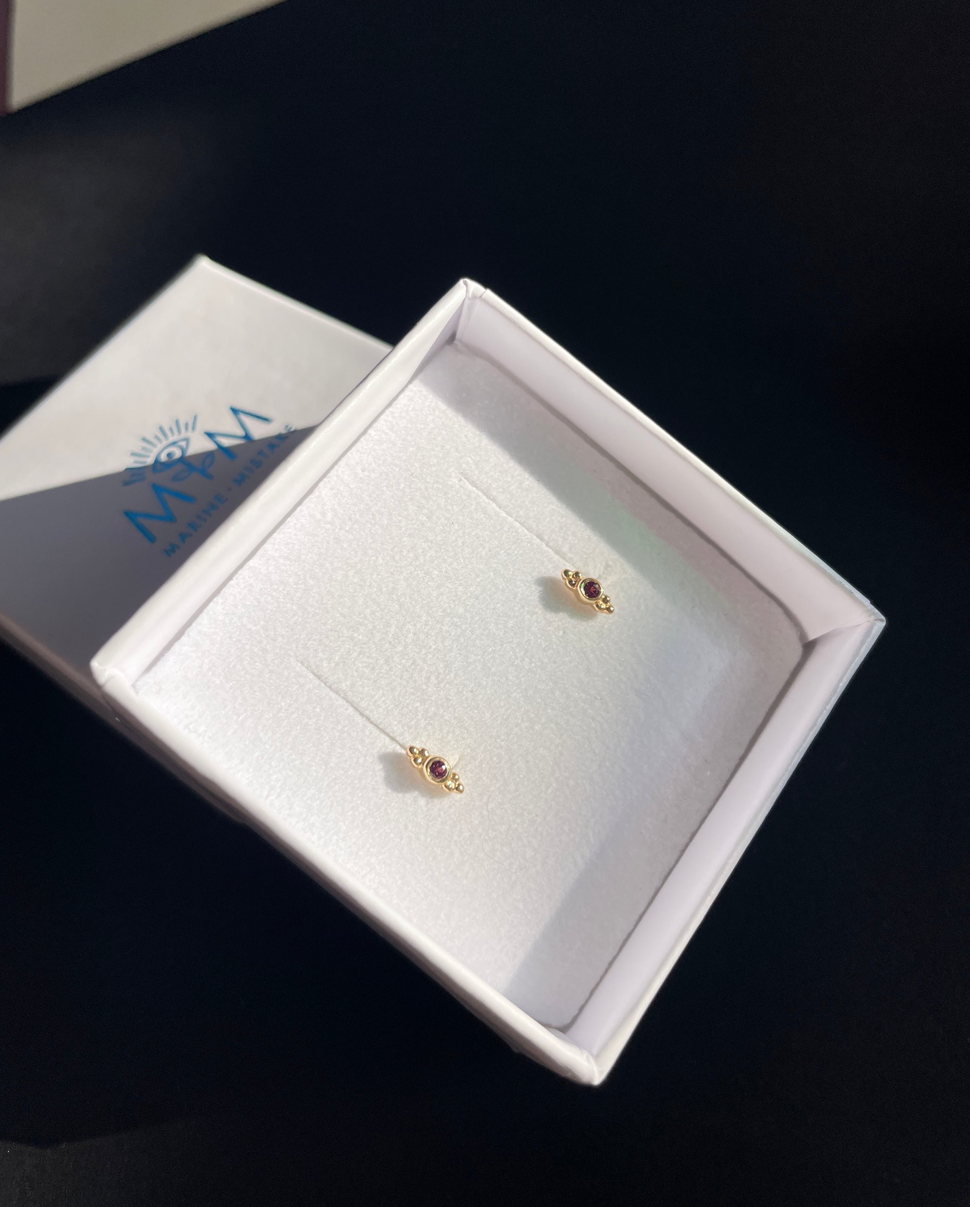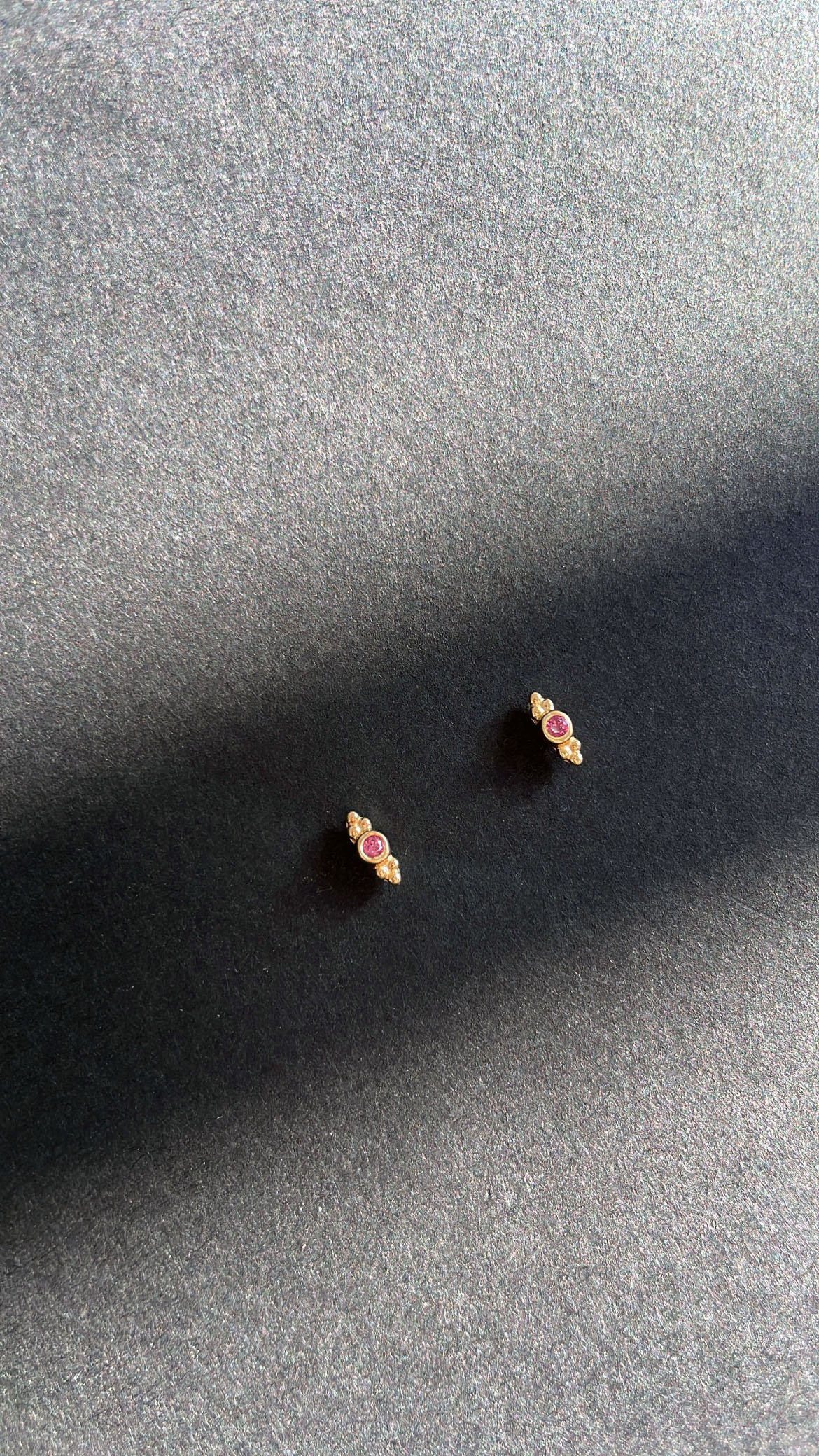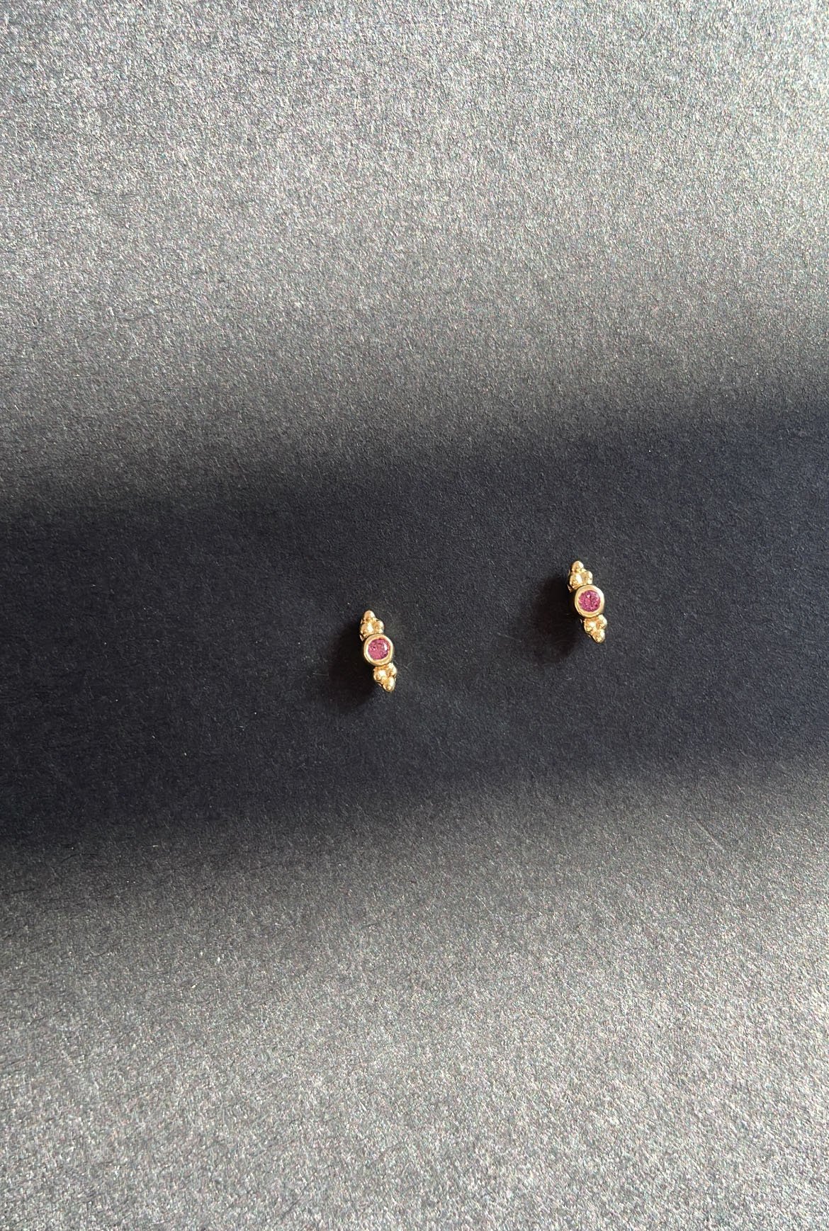Petites puces d'oreilles de 6mm en argent plaqué or, délicatement ornées d'un grenat rose lumineux.