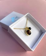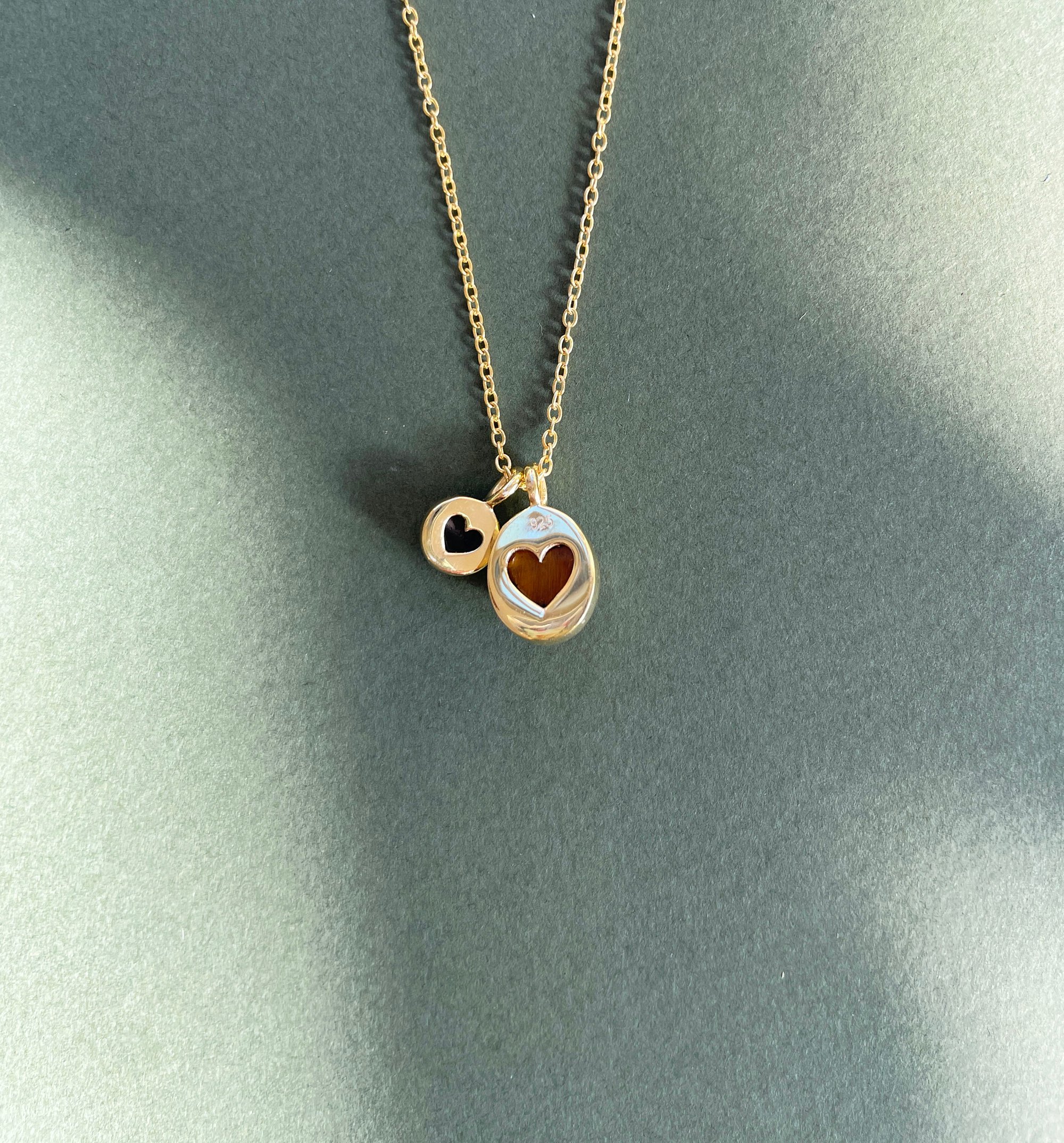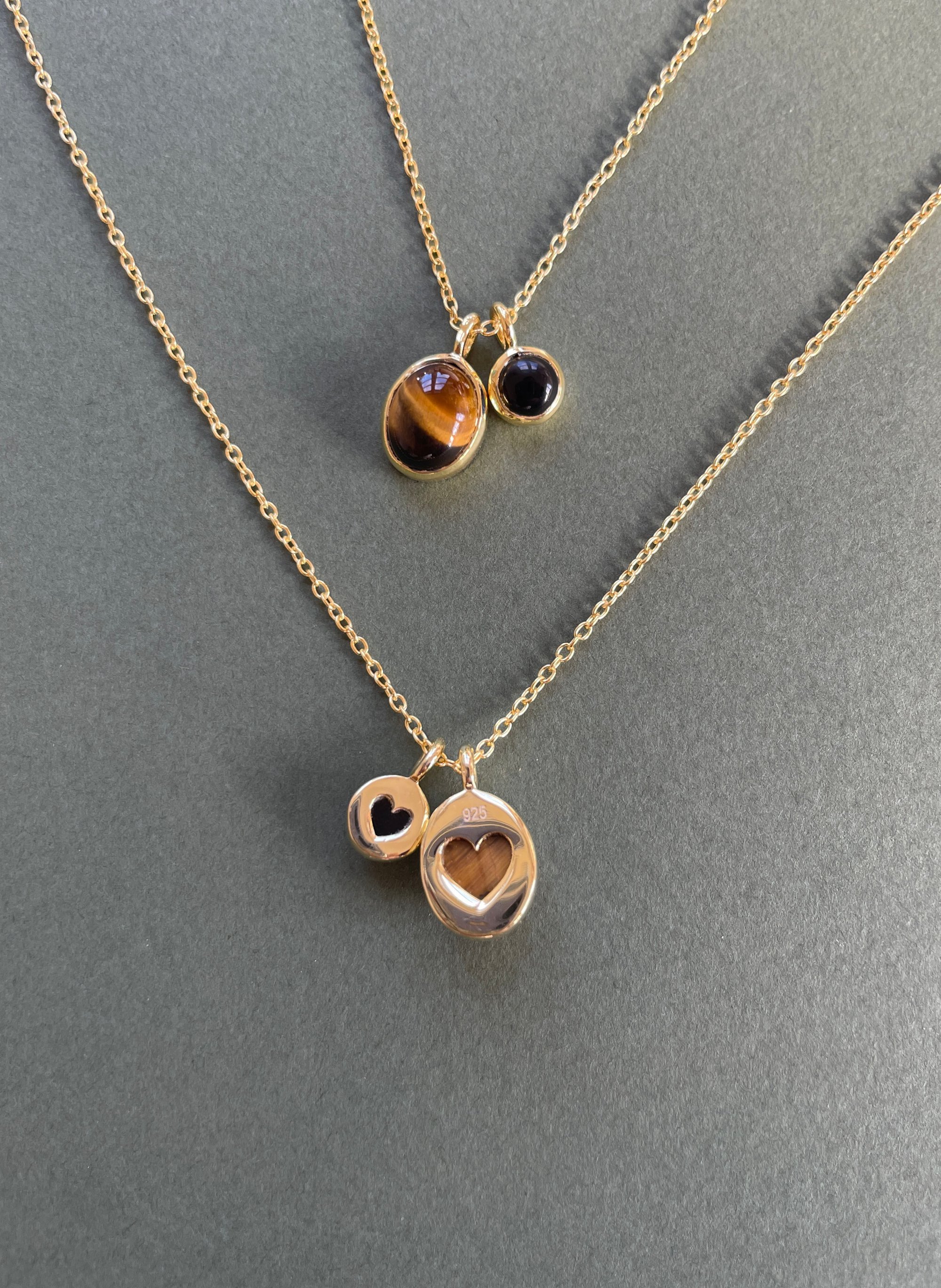Ce collier délicat en argent plaqué or est orné de deux petits médaillons, l’un en œil de tigre, l’autre en onyx, pour un duo de pierres aux reflets lumineux et subtils.