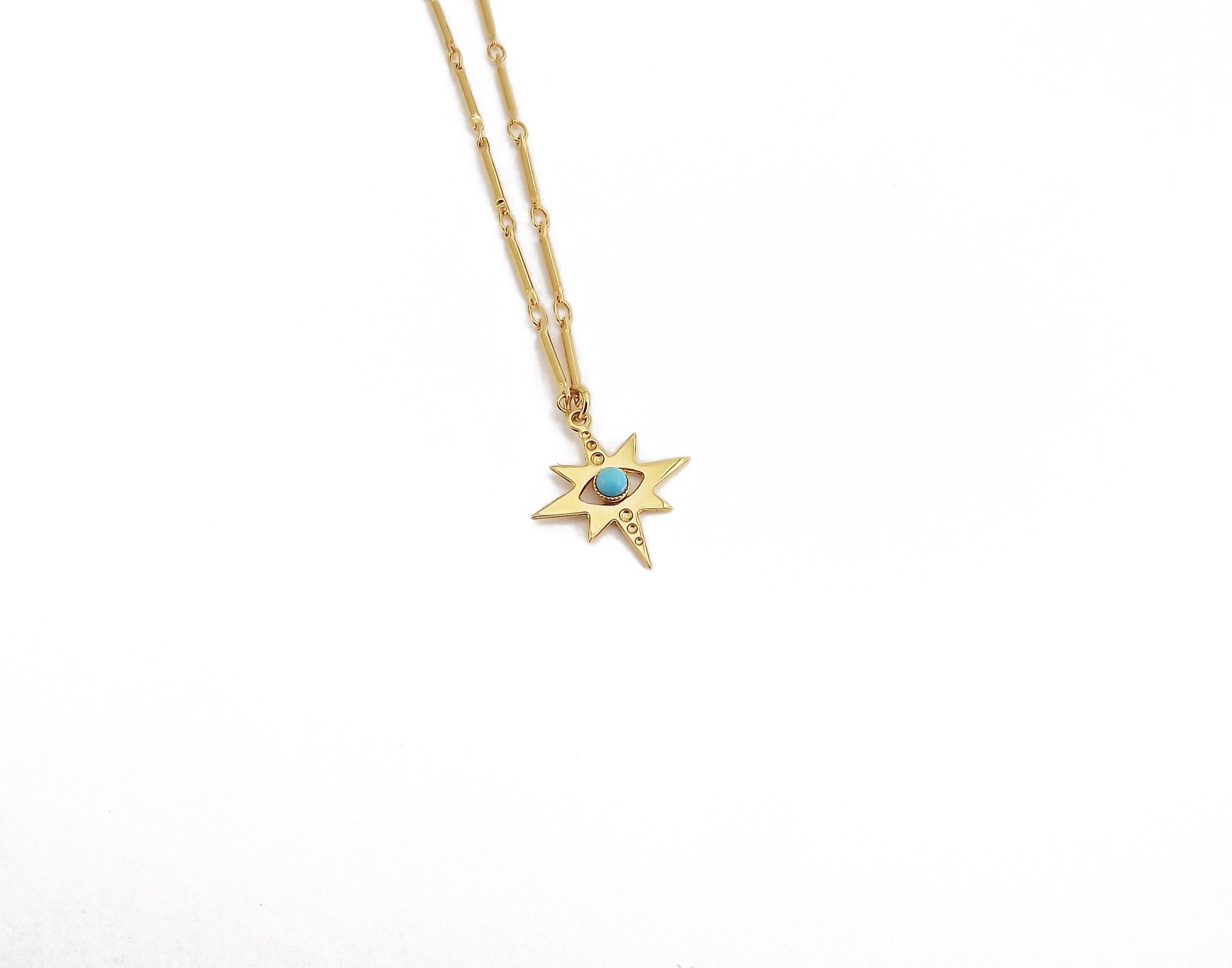 Collier Grigri étoile turquoise en laiton plaqué or 24 carats.