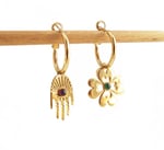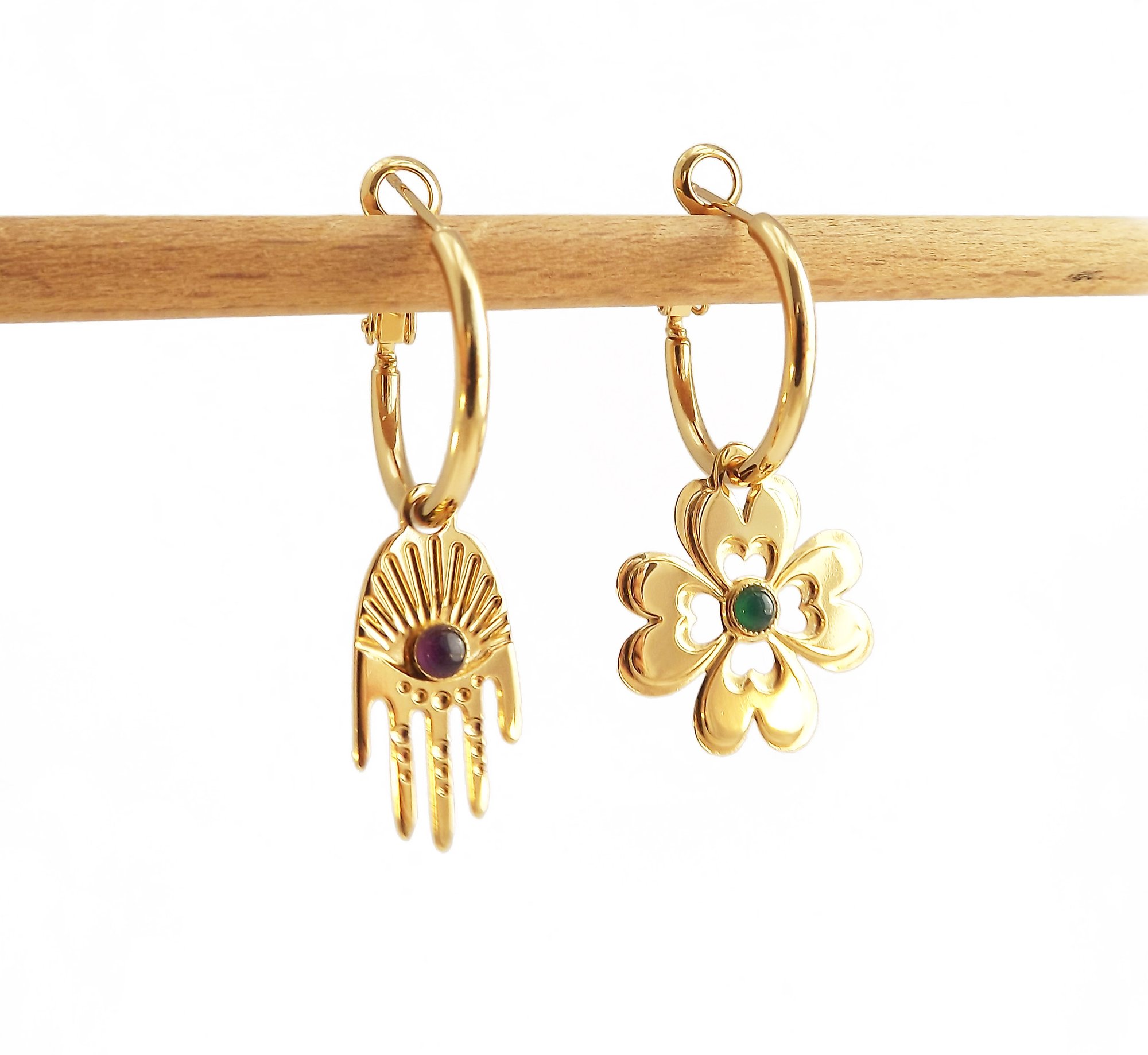 Boucles d'oreilles dépareillées grigris main améthyste, trèfle onyx verte.