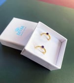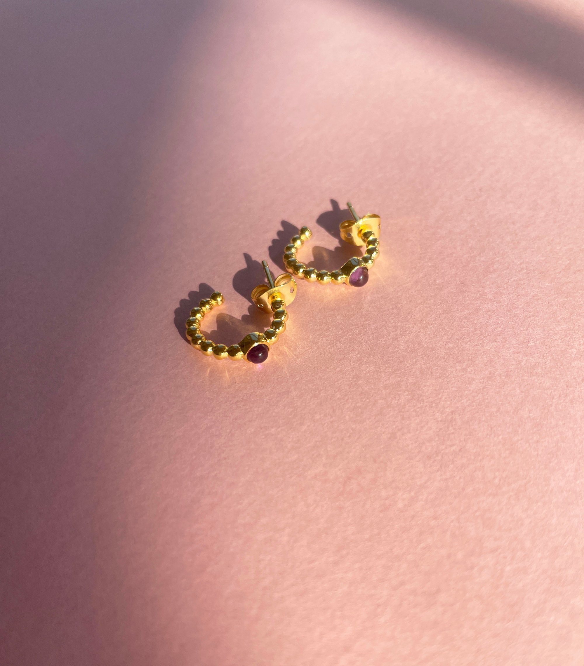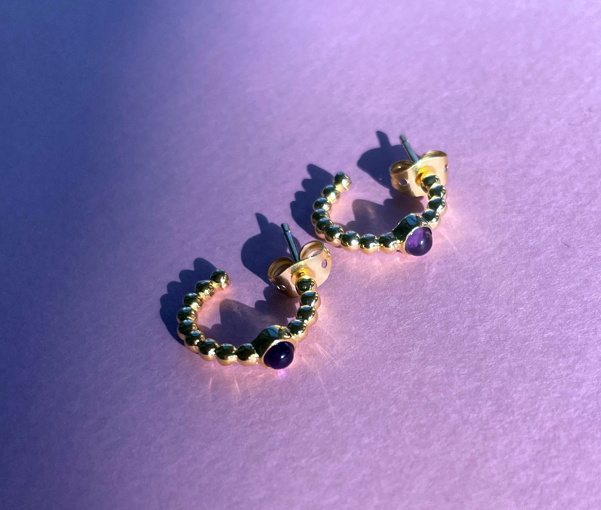 Créoles de 1,5 cm en laiton plaqué or avec améthyste, discrètes et délicates.