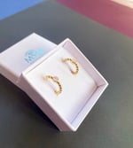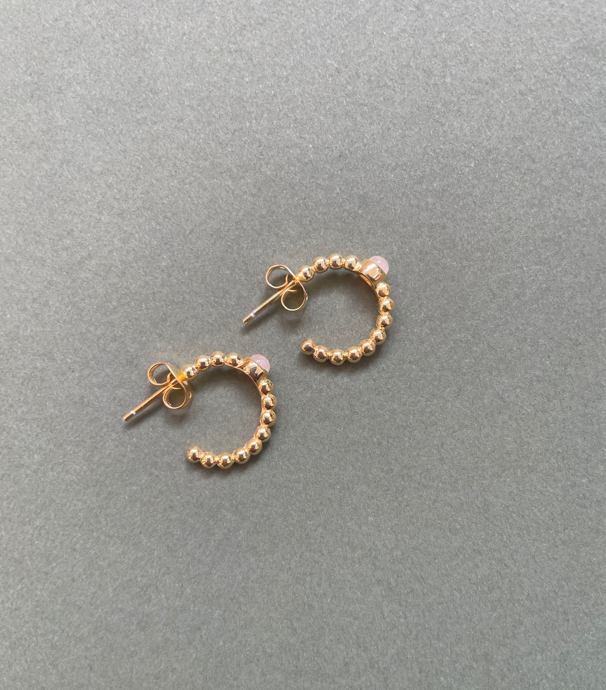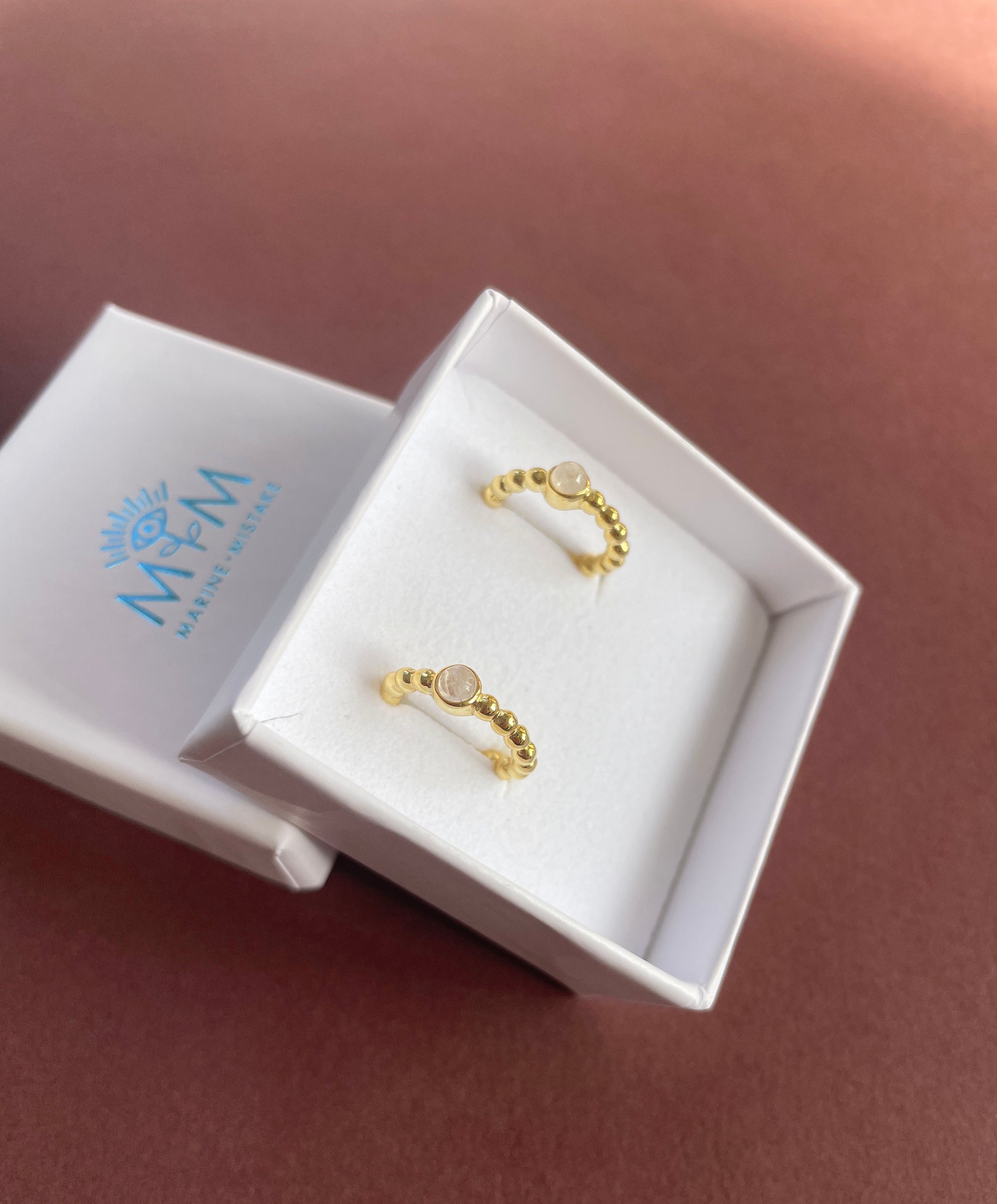 Créoles de 1,5 cm en laiton plaqué or avec pierre de lune, discrètes et délicates.