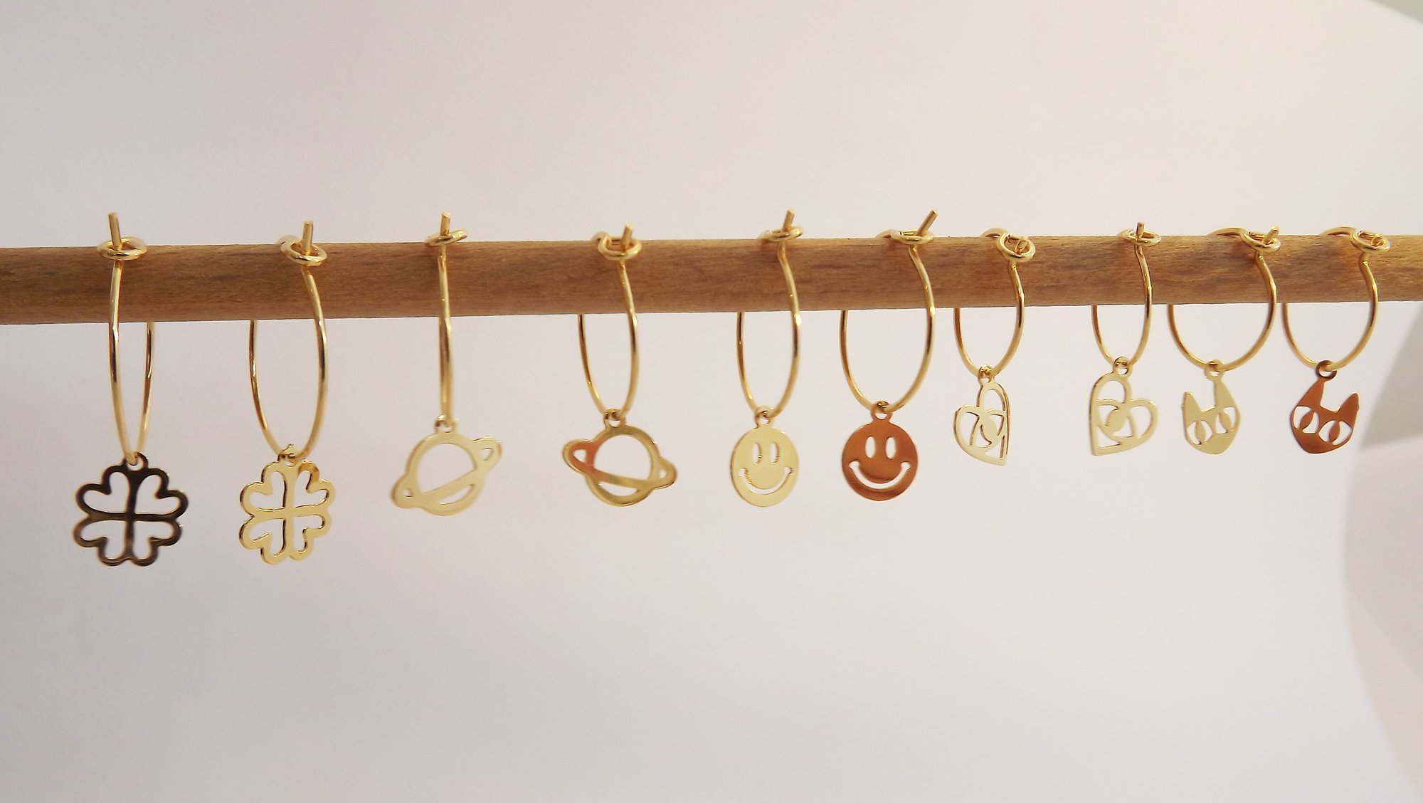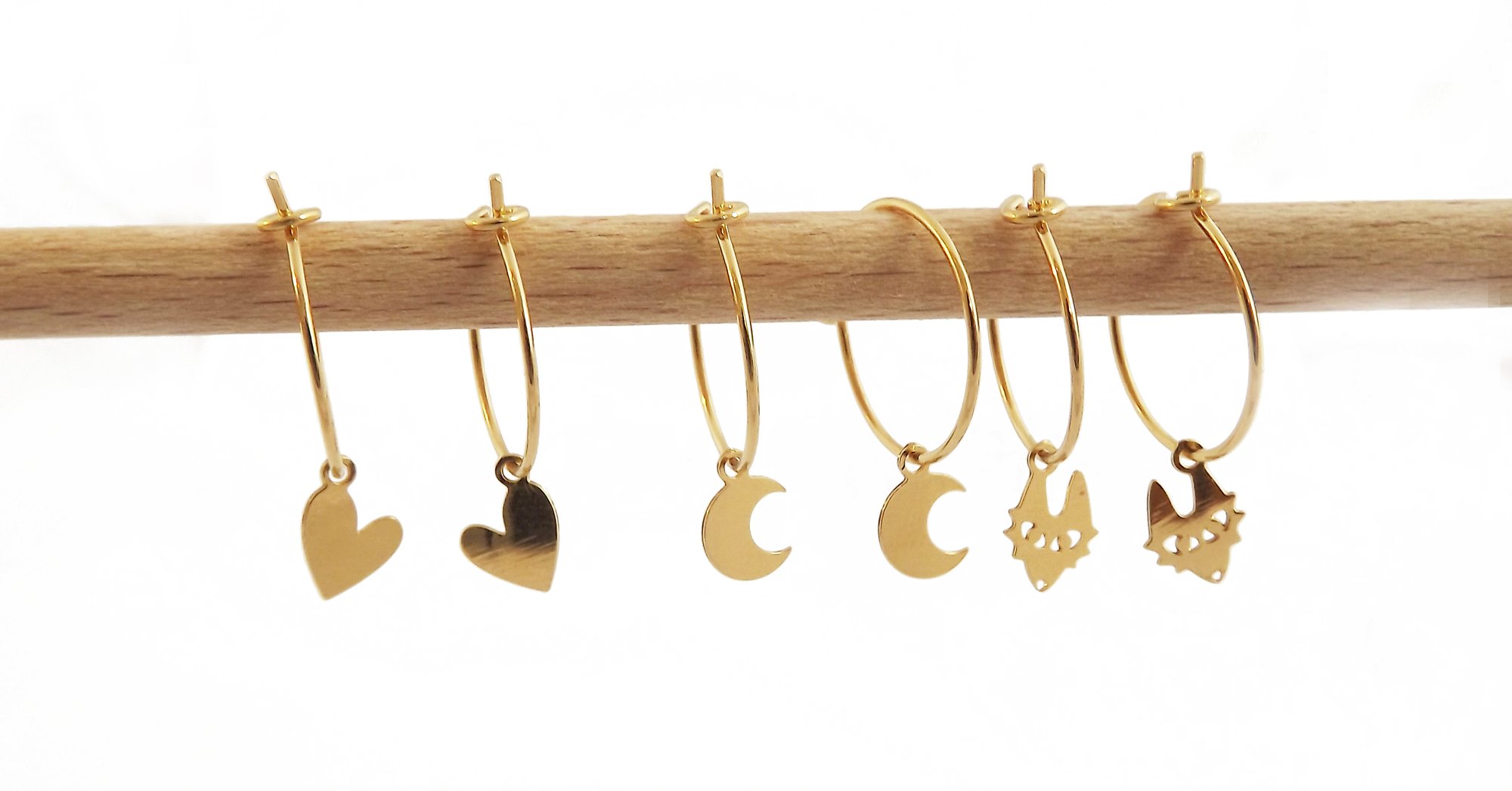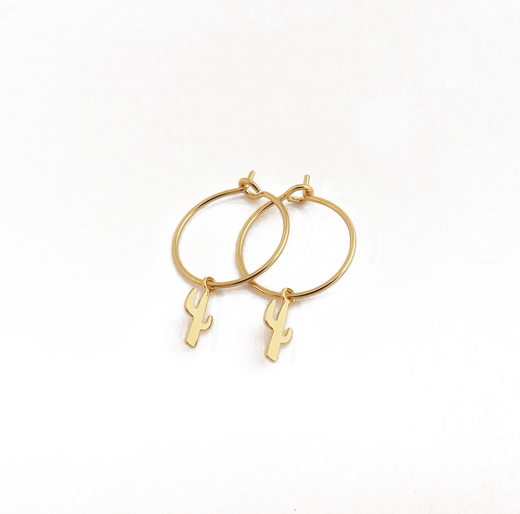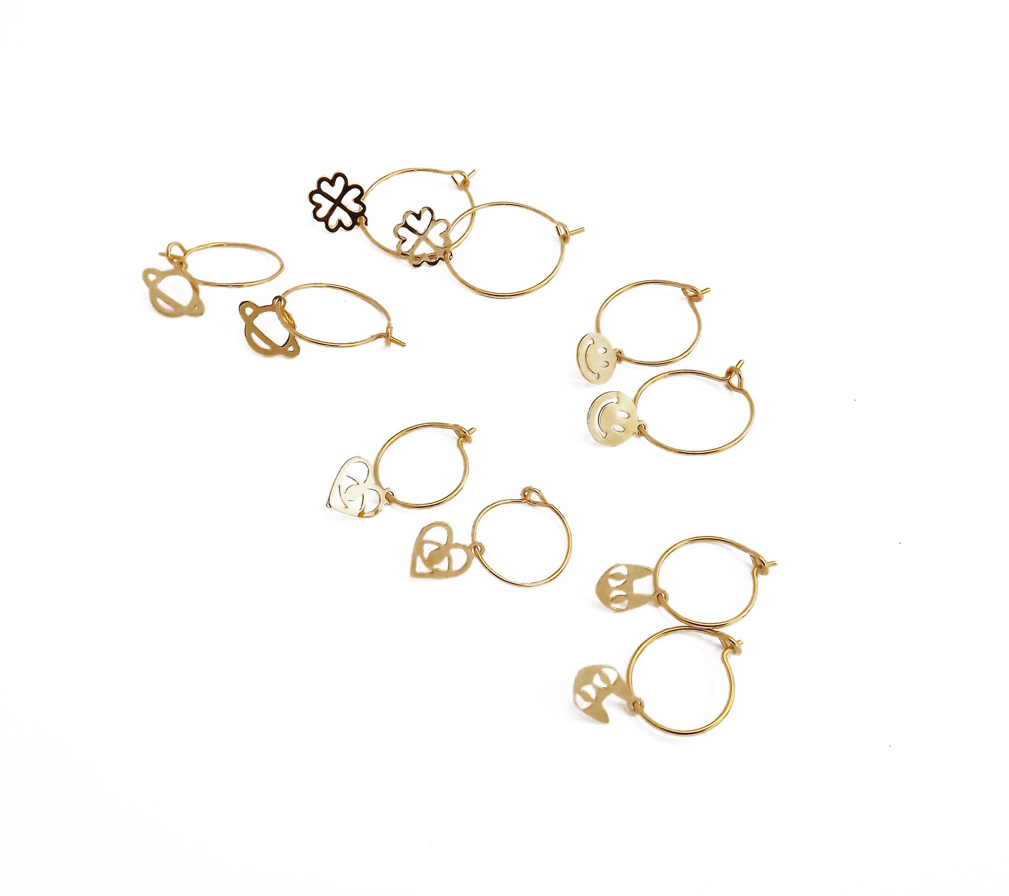 Créoles fines Mini avec petits pendentifs en laiton dorés à l'or fin 24 carats.