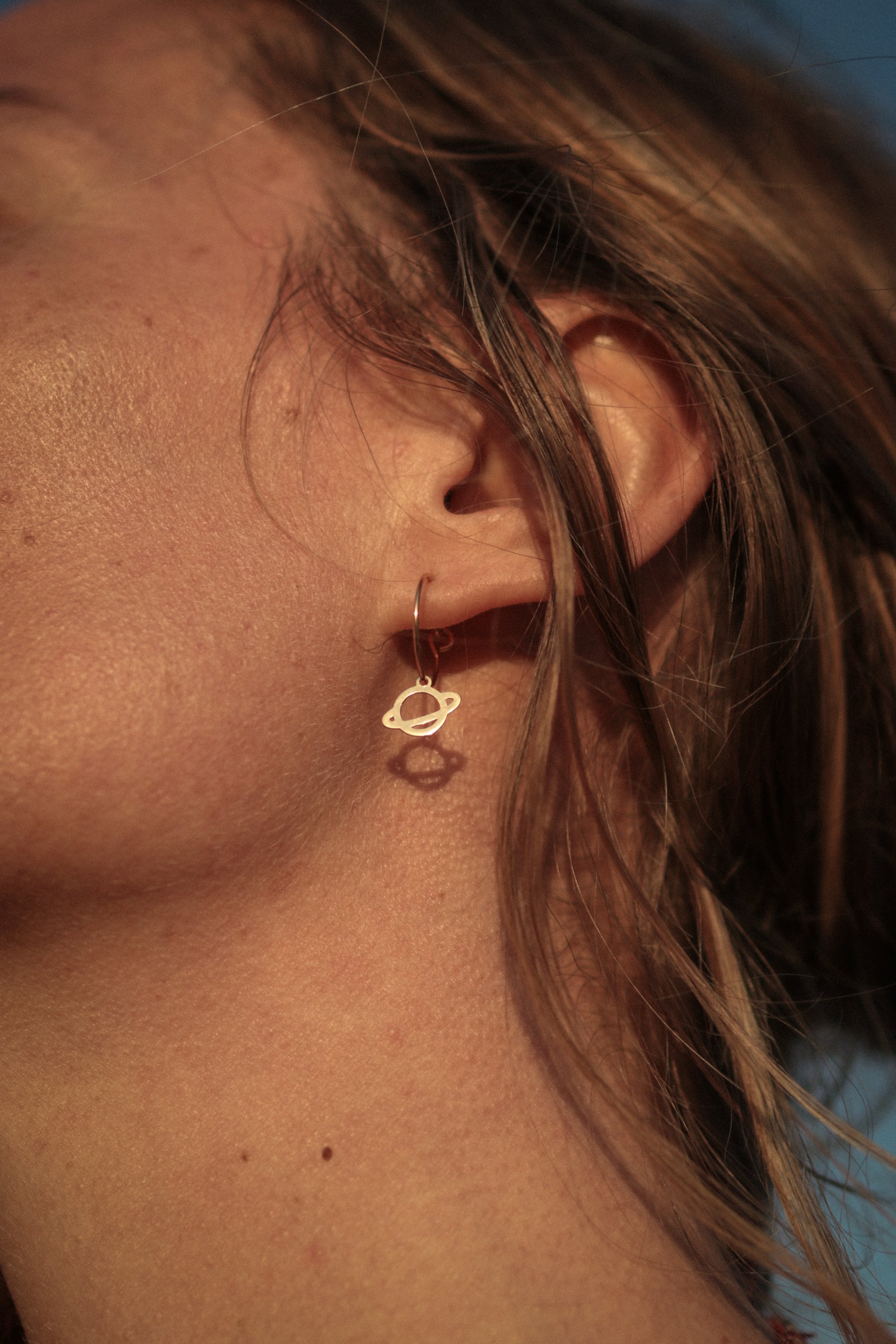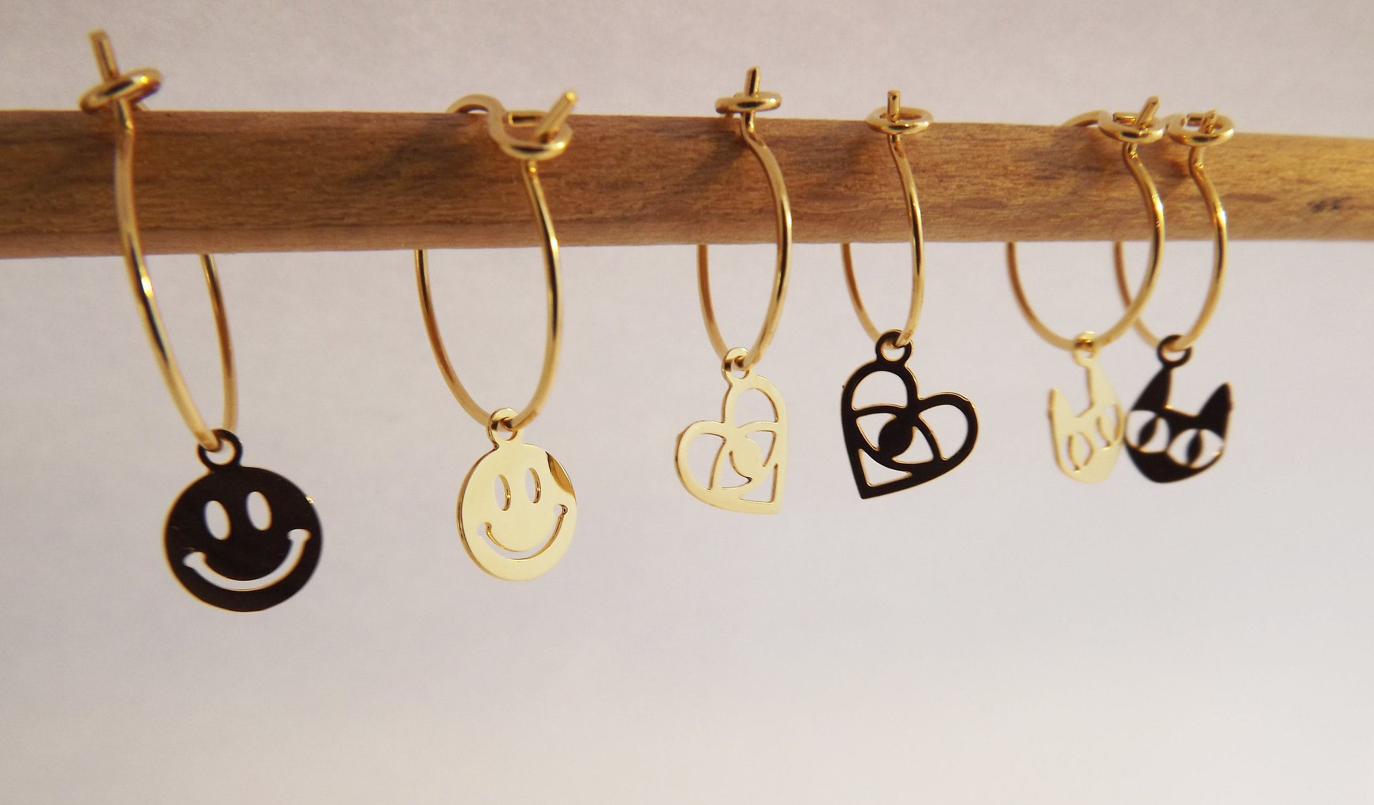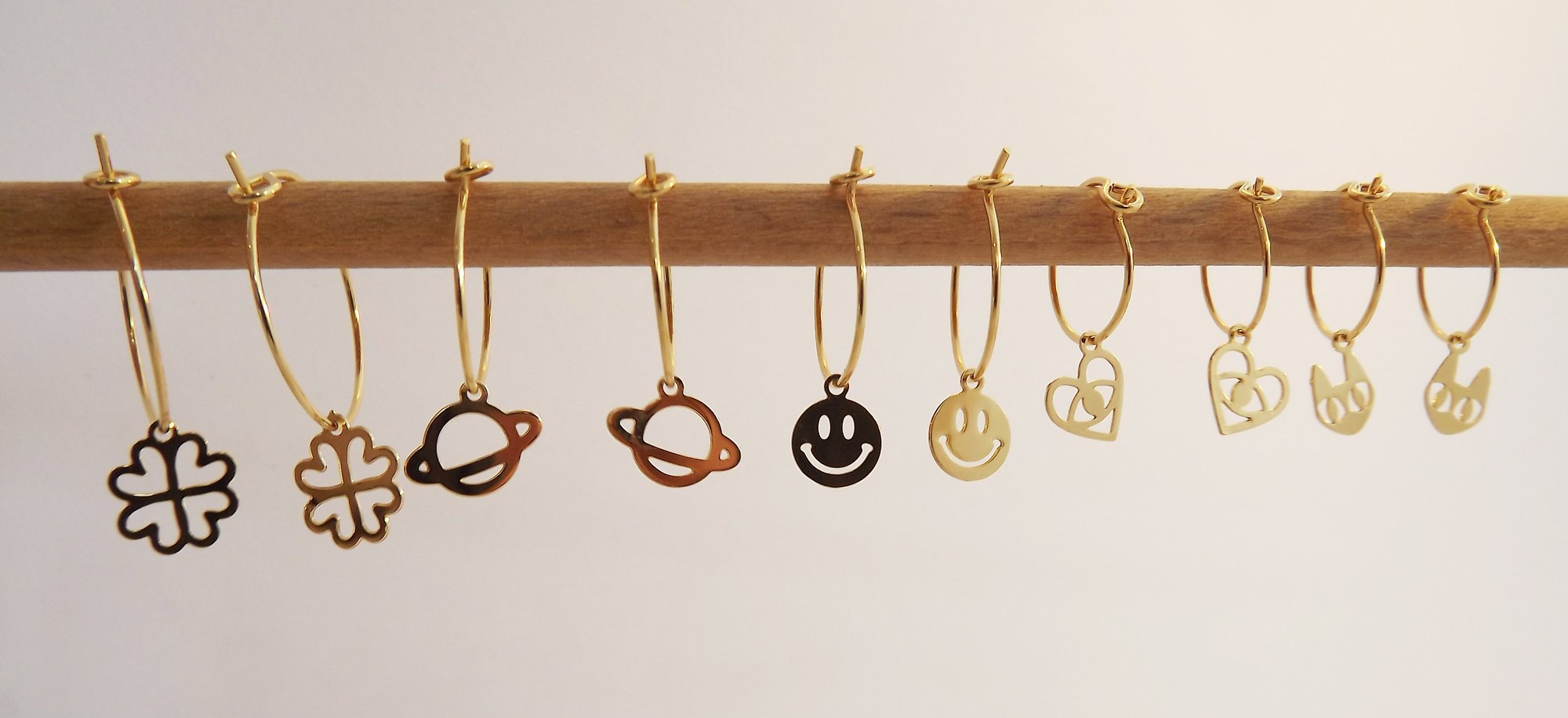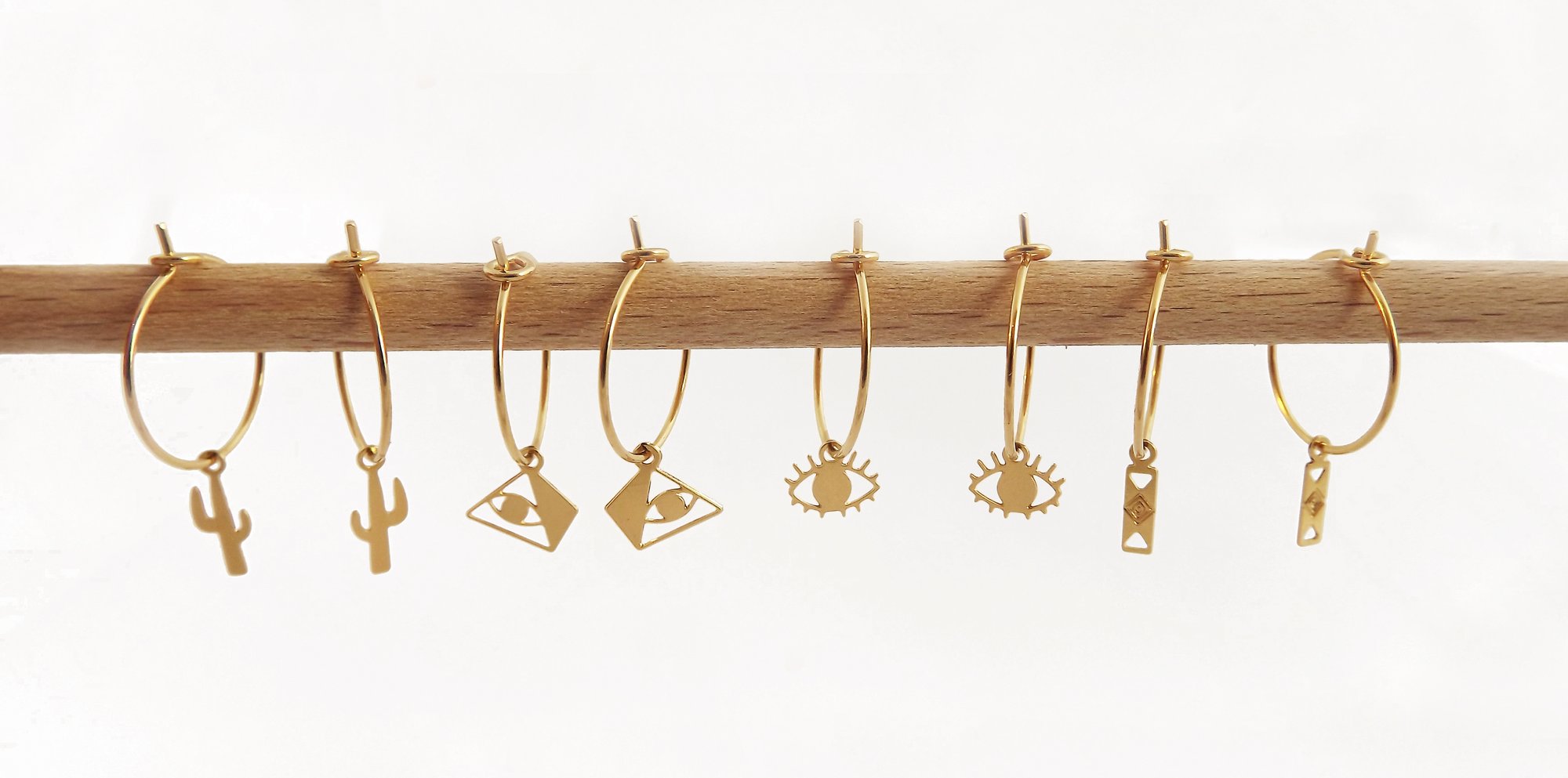 Créoles fines Mini avec petits pendentifs en laiton dorés à l'or fin 24 carats.